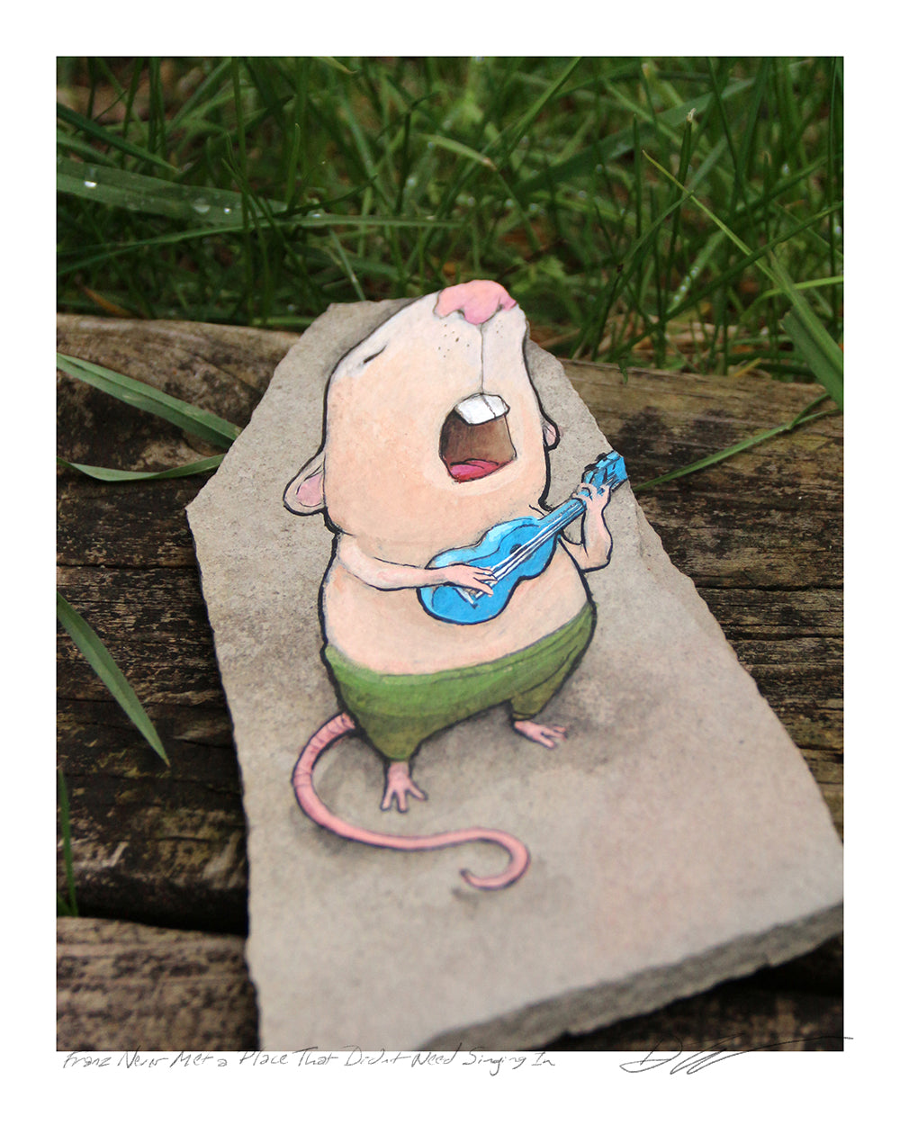 Franz never met a place that didn't need singing in! Photo documentation of anamorphic acrylic painting on construction debris. No rats were inconvenienced in the making of this artwork.