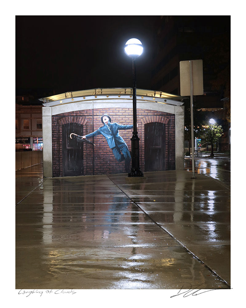 This mural is one of the only large-scale permanent art installations by David Zinn, and one that requires careful interactive viewing. (Hint: there is no streetlamp in the painting.)