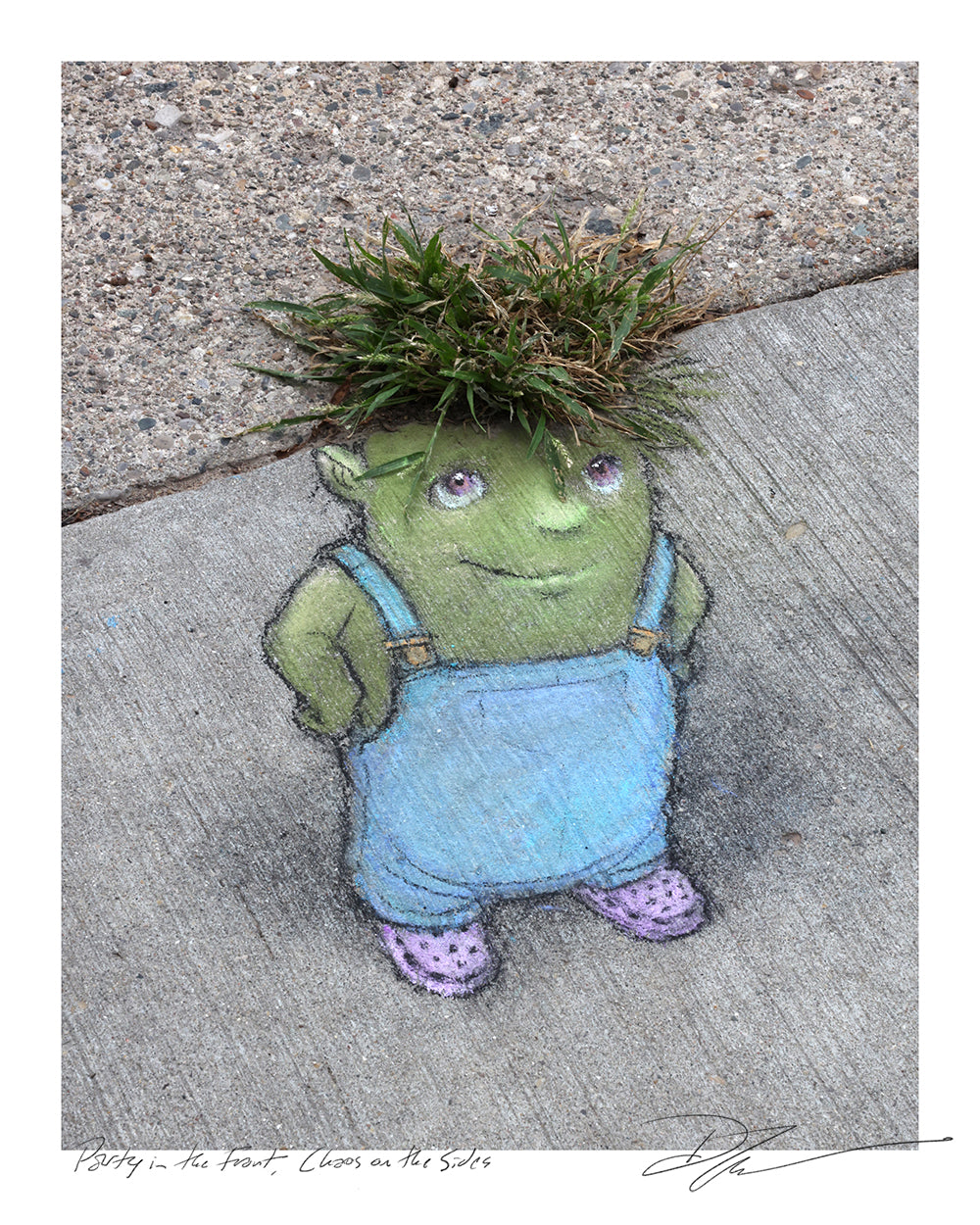 Aiden's hairstyle is "party in the front, party in the back, and unbridled chaos on the sides." This irreverent gremlin was drawn in Ann Arbor, MI in August 2025 with chalk and charcoal on a weedy walkway.