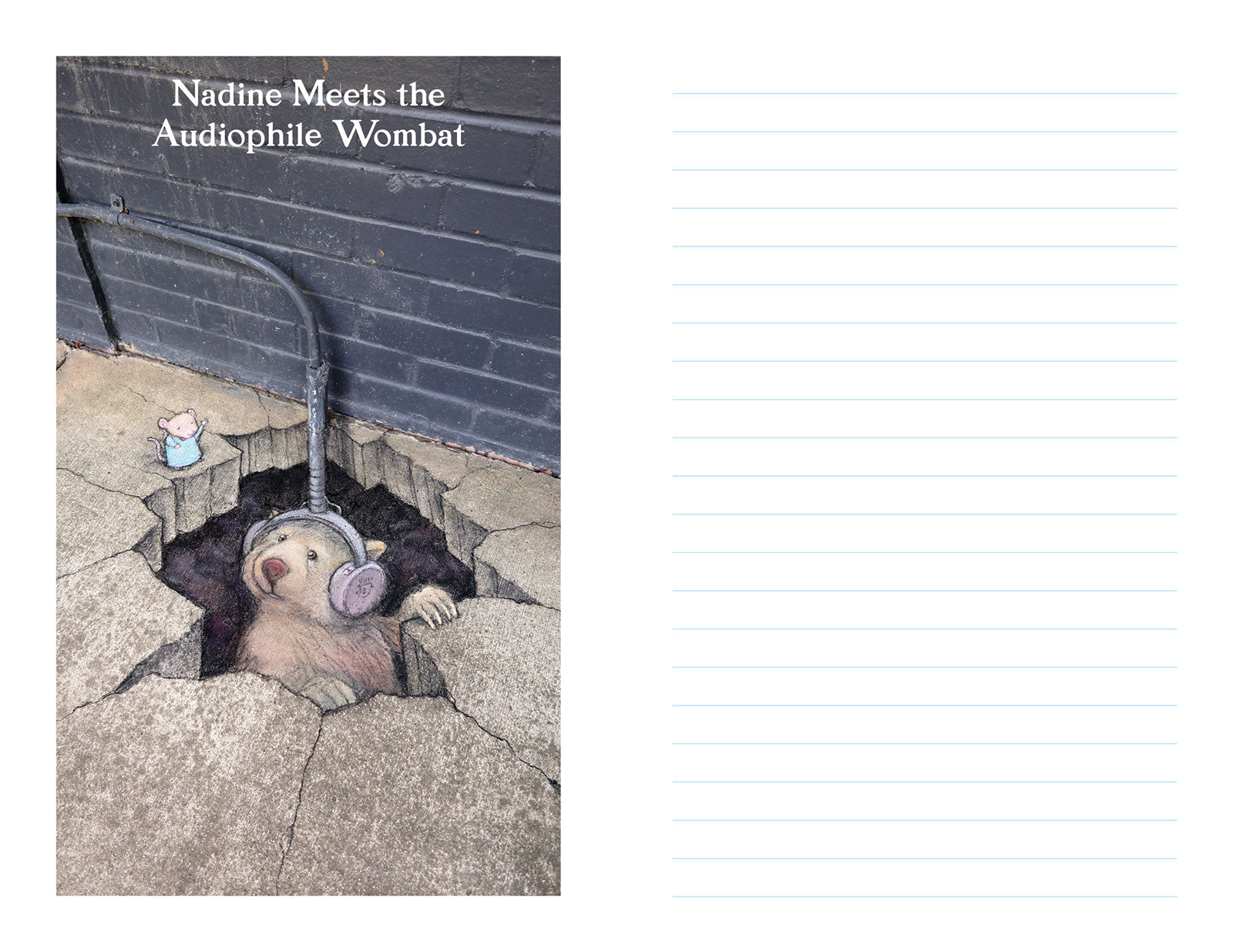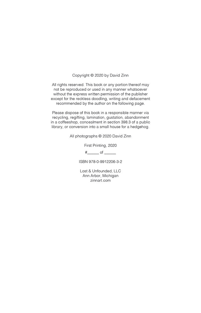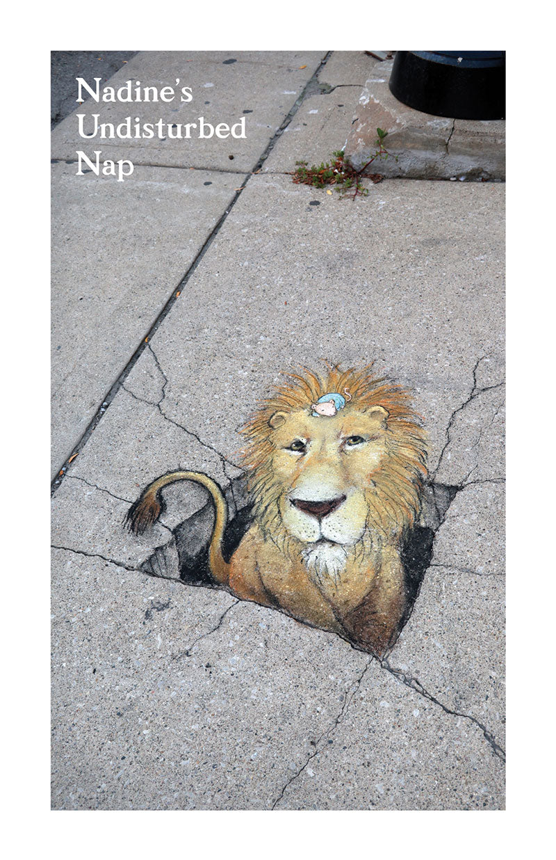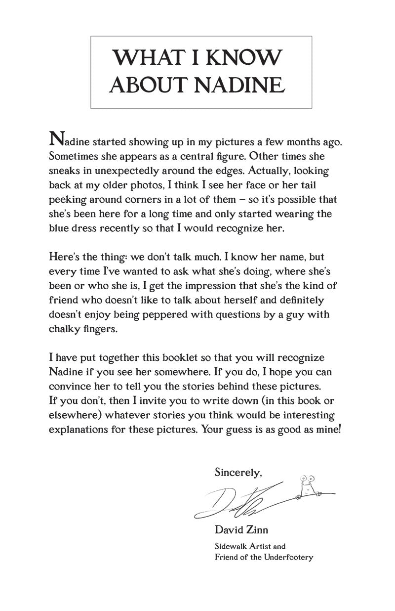 This slim booklet is two things: a collection of Nadine's courageous moments and an experiment in interactive storytelling. Each of the twelve interior photos is accompanied by a chapter title (e.g. "Nadine and the Verdant Chapeau") and a lightly lined blank page on which to record the as-yet-unknown details of her adventures! (For repeat use, additional stories can be stapled inside or collected by other means.)